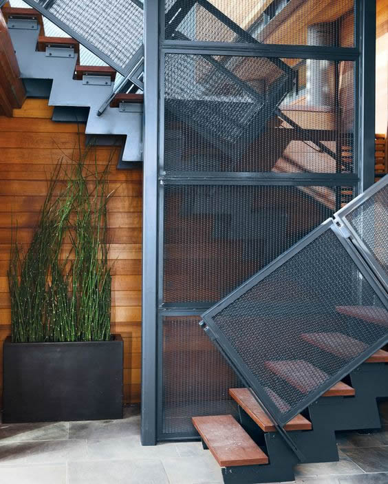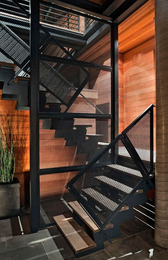 Стиль лофт создает эффект присутствия на фабрике, промышленном предприятии благодаря использованию таких элементов, как строгие графические металлоконструкции, решетчатые ограждения. Лофт 3 – оптимальный вариант ограждения для оформления лестниц, лестничных пролетов в офисе или доме, где есть высокие потолки. В каркасе из нержавеющей стали, между прямоугольными стойками, надежно зафиксированы металлические сетки мелкой фактуры. Визуально такая конструкция не выглядит массивно, наоборот – в ней много воздуха и объема. Сетчатый узор выглядит просто и стильно. В дизайне ограждения используются детали, как прямоугольной, так и треугольной формы или их комбинация. Составляющие части ограждения плотно фиксируются между собой при помощи специальных креплений-скоб.
